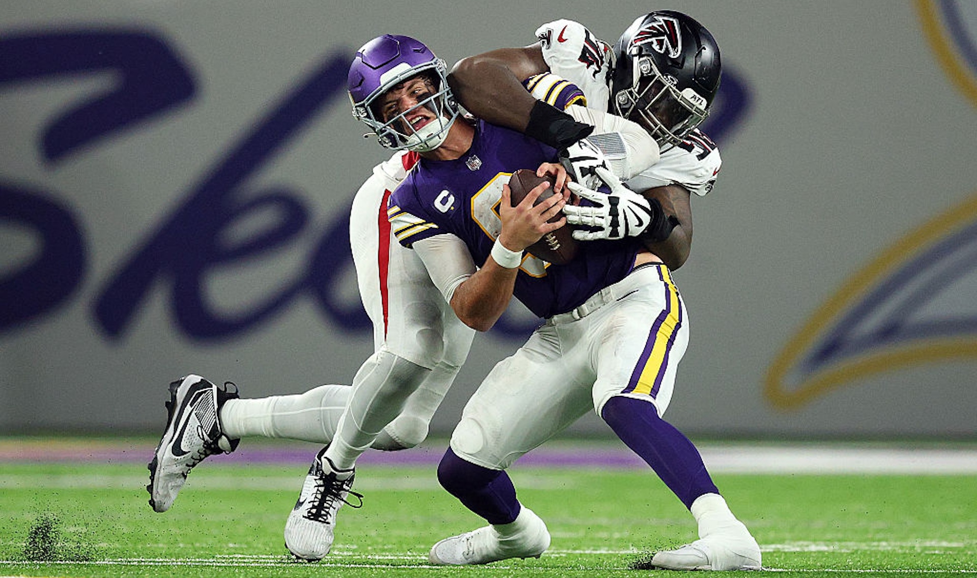 Because the data is even uglier than the tape. McCarthy was sacked six times and turned the ball over three times. He held onto the ball for well over three seconds per dropback: a death sentence in the NFL, especially if two of your best O-linemen are already out of the game. He all but ignored the left side of the field all game long, and overshot a wide-open Jalen Nailor streaking past Atlanta’s secondary when he finally acknowledged that area’s existence. In every regard, McCarthy was wholly unprepared to conduct an NFL offense. Both his team and his body suffered for it: