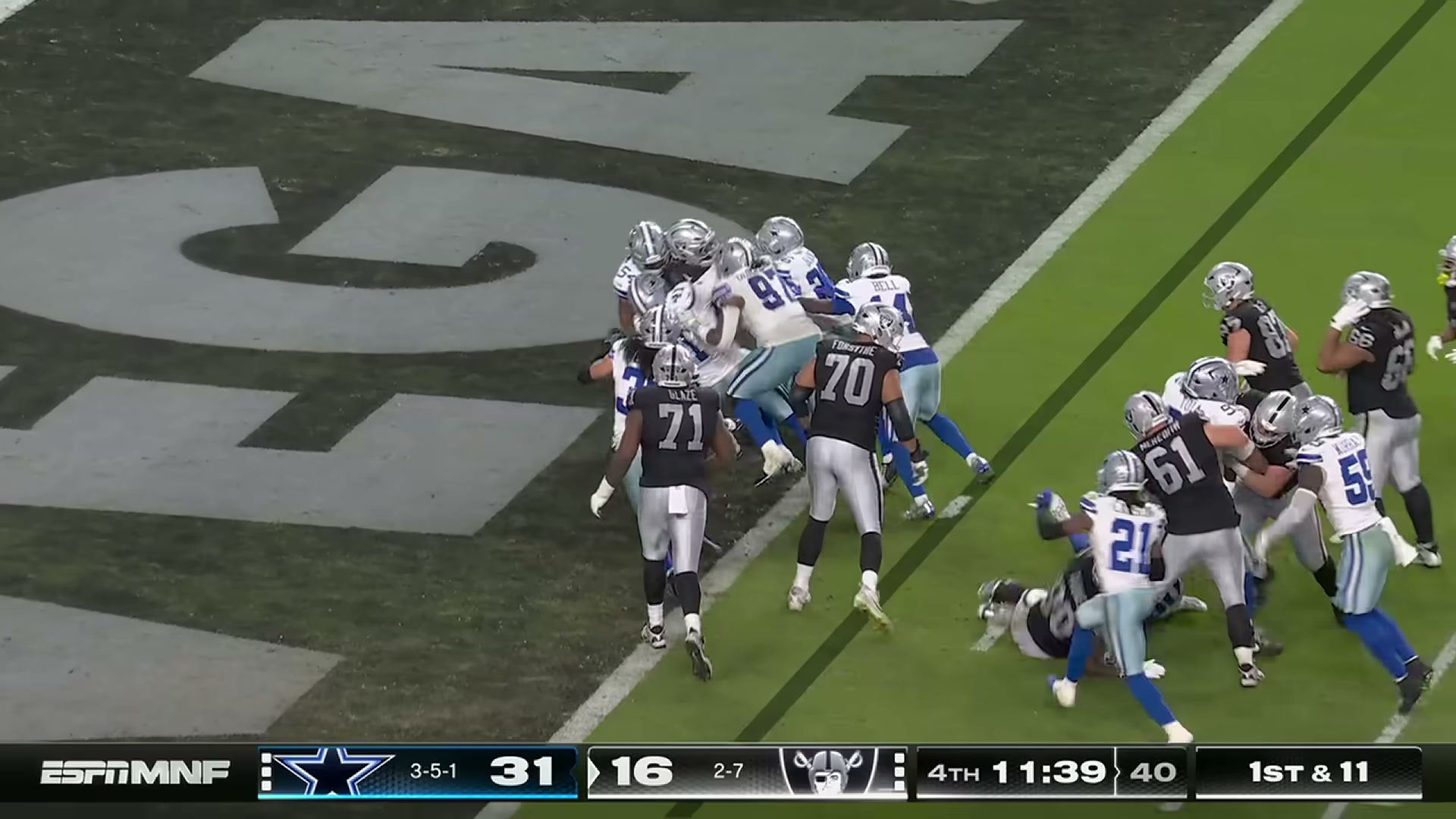 Instead the play was A Nightmare On Al Davis Way. Jeanty ran into the line, or in the direction of it, but never got there. To say that he didn’t get any positive yards before contact or after it is correct, but somehow an understatement. The Cowboys tackled him in the end zone for a safety. What made this play particularly funny was just how many Cowboys were involved. Let’s take a look.